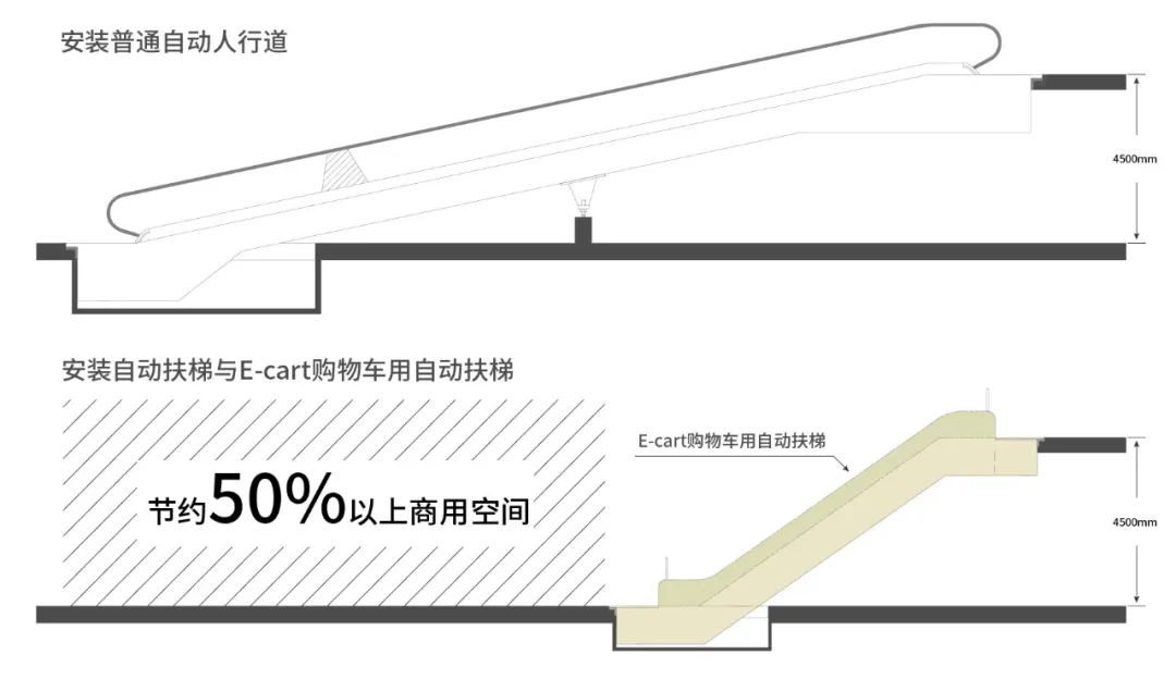 為了解決廣大商場超市、購物中心因建筑結(jié)構(gòu)空間不足,不能安裝自動(dòng)人行道,或已安裝自動(dòng)扶梯不能上下運(yùn)輸購物車,從而影響顧客購物體驗(yàn)的問題。西尼最新研發(fā)的E-cart購物車用自動(dòng)扶梯可輕松加裝,提升購物體驗(yàn);同時(shí),可有效避免人車共用運(yùn)輸設(shè)備的情況,相對于安裝普通自動(dòng)人行道亦可節(jié)省建筑空間,有效提高商場空間利用率。